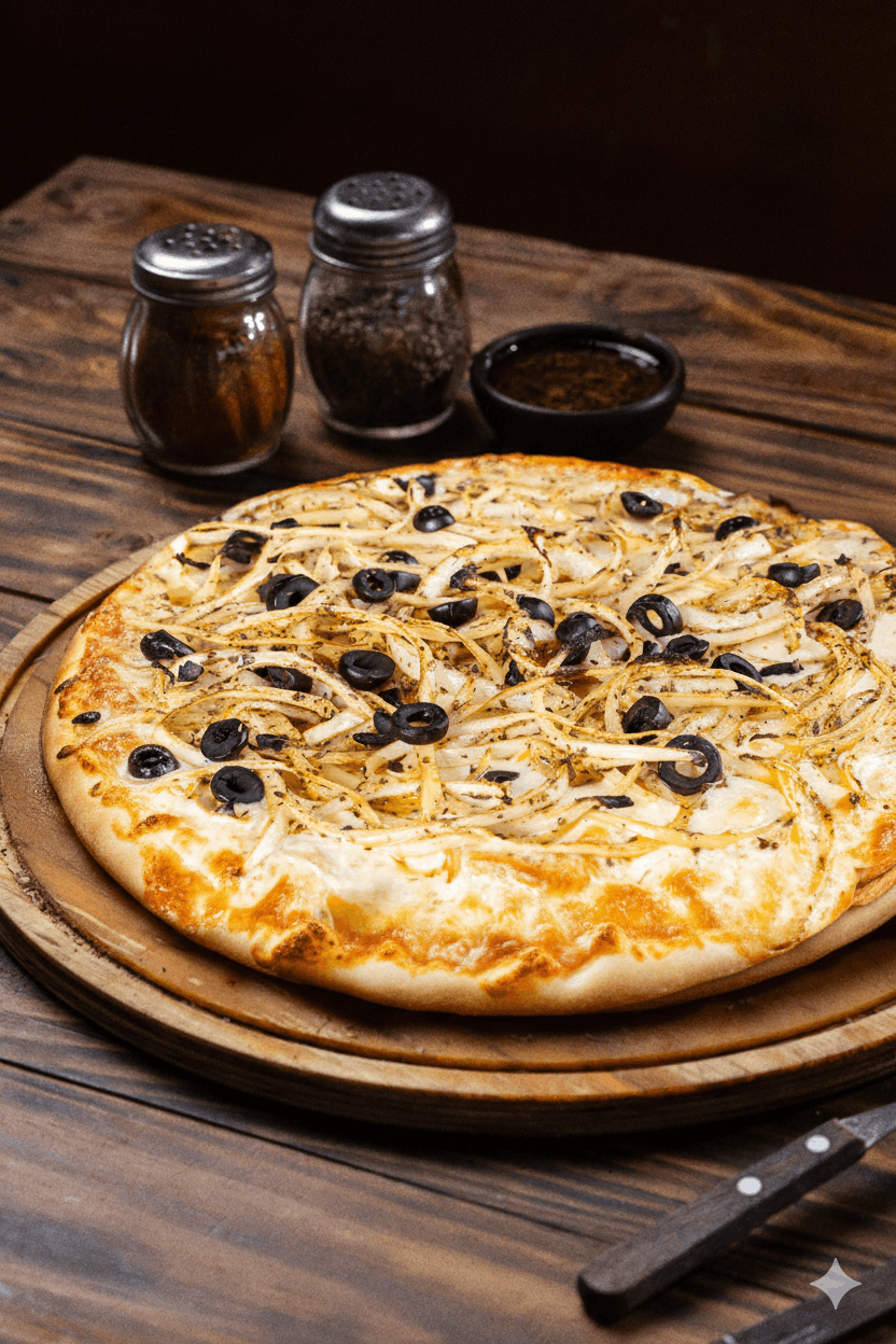 Muzza, cebolla, aceitunas y orégano.
