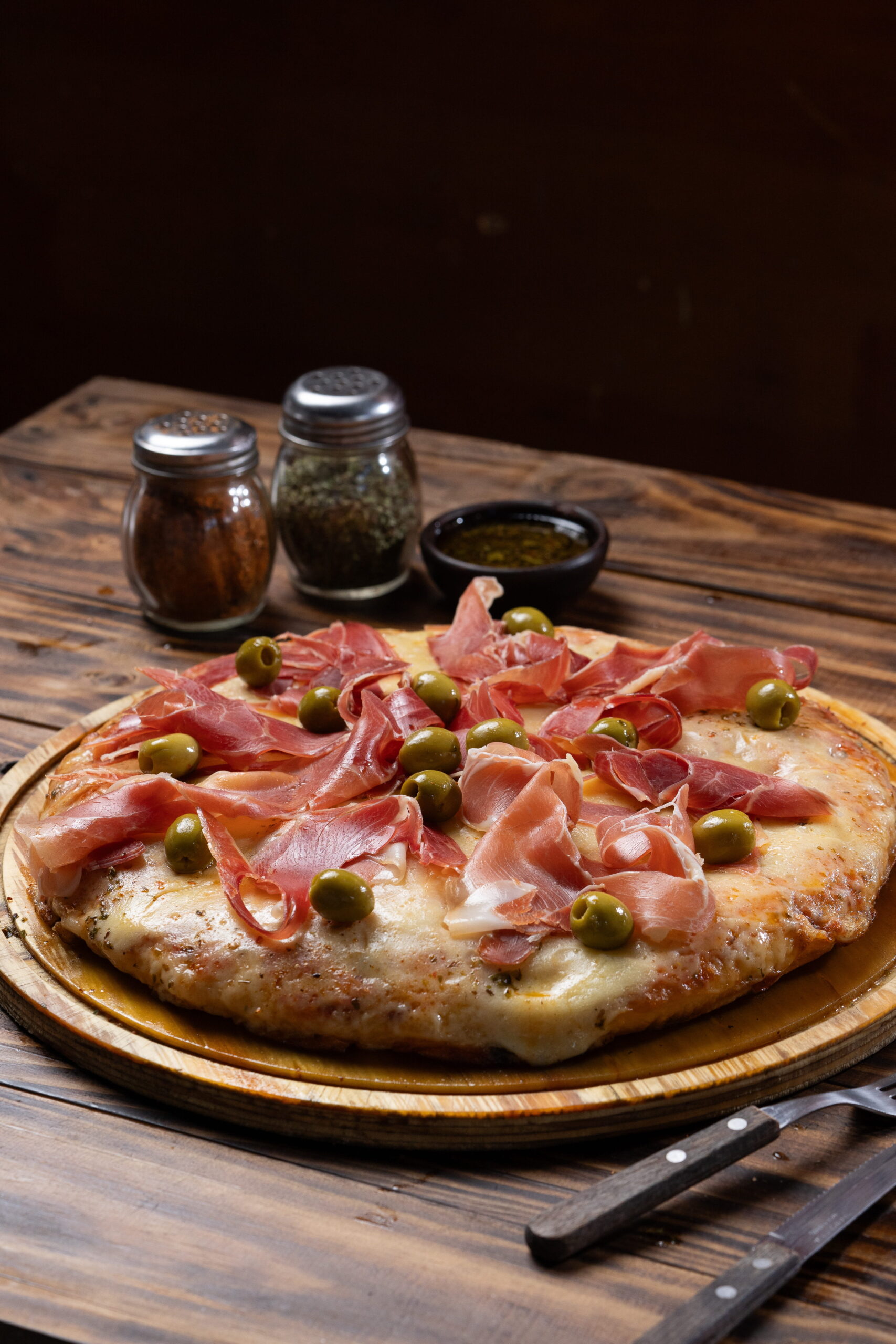 Muzza, jamón Serrano, aceitunas y orégano.