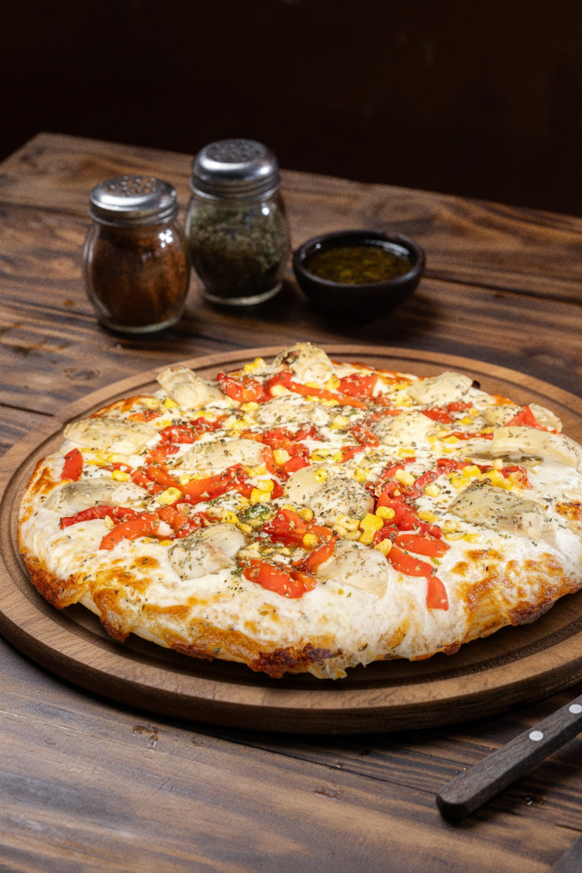 Muzza, alcachofa, choclo, pimentón rojo y provenzal.